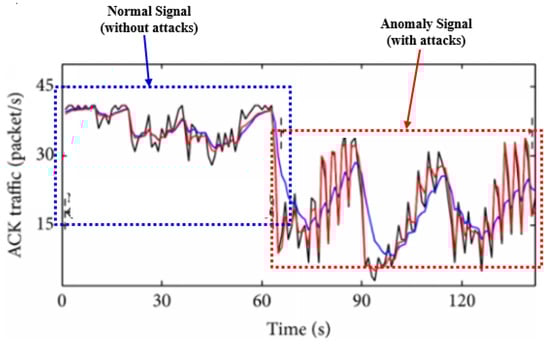 In [3], the research analyzes ML (Machine Learning) applications across IoT data processing and management functions, study directions, and difficulties. The authors worked on how to use ML in numerous IoT contexts which are the attempts to bring headlines to the forefront. This paper included the applications of ML across management functions as well as IoT data processing. In [4], the study offers a scientific classification of some dangers of the existing IoT security, and provides a guide for novel and energizing research difficulties in applying ML and SDN (Software-Defined Network) ideas to address IoT security concerns. In [5], the authors reviewed the applications of ML in cybersecurity. There has also been a debate on the risks of utilizing cyber attacks as training and testing data for classification. In [6], the authors surveyed the overviews that have used ML and DL (Deep Learning) in the related research areas such as networking, communications, and lossy environment. The primary objective of this survey study is to distinguish potential topics and challenging tasks for using different deep learning and machine learning algorithms. In addition the surveys all overview the several works that have used the ML/DL techniques which include networks, communications and so on. The main object of those studies is to distinguish the potential topics and challenging tasks for using the ML and DL algorithm. In [7], the authors study different machine learning and deep learning algorithms used to develop network intrusion detection and strategies used to define cybersecurity and intrusion detection accuracy in addition to existing blockchain technology applications. In [2], the authors suggested an intrusion detection by smart meters for cybersecurity. The strategy attempts to detect intrusions by monitoring computer systems, such as memory, storage, CPU resources, and all network traffic, with a smart meter. However, the system is impractical as it has to check for all resources. In [8], the authors analyzed some anomaly detection for cybersecurity based on CNN (Convolution Neural Networks) as a survey. CNN is utilized for its ability to process an input-value with multiple dimensions. Almost all solutions which have been studied usually have gathered and classified the input data and perform a pre-processing.So, if the pre-processing is wrong, the result for anomaly detection would be not good. To solve this, this study in [8] suggested the unified cross framework which simulates end-to-end anomaly detection mechanisms. Authors in [9] applied detailed research methods to the safety problems and dependable tactics from a data-driven viewpoint, when learning and evaluating or inferring machine learning. The authors emphasized the drifting of data distribution and the leakages of the sensitive information issues in predictable ML algorithms. In [10], the authors studied anomaly detection in machine learning of network analysis of intrusion detection and define a brief walkthrough summary of the ML and DL techniques. In [11], anomaly signals are detected from normal signals. The statistics results of traffic based on the AEWMA (Adaptive Exponentially Weighted Moving Average) algorithm and the EWMA (Exponentially Weighted Moving Average) algorithm are shown in Figure 1.