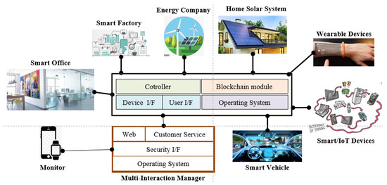 Figure 2 shows the structure of an energy network [1] that we studied as an energy trade system which consists of a consumer, a producer, a module of blockchain , and a multi-interaction management agent. This model contains a producer and a consumer who are a representation of an interconnected user. The prosumer alternates between two roles according to what users need. The users will be granted roles only after authentication by the trusted server. Furthermore, the users will be linked to one another in a grid, and they will share the energy. With the use of the shared information, the users that want to buy request the amount, and the seller receives these purchase requests. The model processes with a bi-direction structure to sell and to produce the energy from a smart factory, an energy company, a home solar system, a wearable device/IoT device, a smart vehicle and a personal office and so on. There is also a multi-interaction manager agent (MiM agent) and the MiM agent functions as a manager of the energy trade in the energy network. The energy network consists of a controller, device I/F (Interface), user I/F, blockchain module and operation system. In Figure 2, the energy company only produces energy. The home solar system can be either a consumer or a producer. A personal office, a smart factory, wearable devices, smart IoT devices and smart vehicles are customers. Generally all participants contact an MiM agent to monitor the current information. If one of the customers wishes to buy energy, the customer contacts the MiM agent by sending a ‘request message’. If a producer wants to sell energy, the producer sends a ‘share message’. The ‘share message’ contains (available energy and cost). Consumers have the option of choosing from these offers.