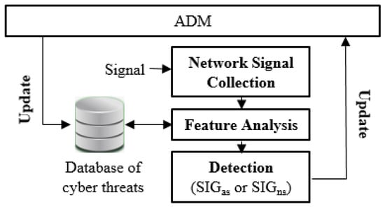 The ADM (Anomaly Detection Model) consists of the next steps: Network Signal Collection, Feature Analysis, Detection and Update (Figure 3). It runs a network signal collection as the first step. In the feature analysis step, it processes by analyzing the relationship of features. Through the feature analysis step, it decides the anomaly signal and next it updates the anomaly signals with SIG or SIG. SIG is an Anomaly Signal(as) and SIG is a Normal Signal(ns). At the network signal collection stage depicted in Figure 4, it runs a collection algorithm ADM to encode xi from the user’s device to the data collector and it collects the Yi ← A(Xi) as output. The network signals including the normal signal and anomaly signal are collected in an array type, and they are stored as a DB (Figure 3). It is collected from each user which is proceeded by ADM [13]. M is a mean, E is an exponent, e is an Euler number and A is an array.