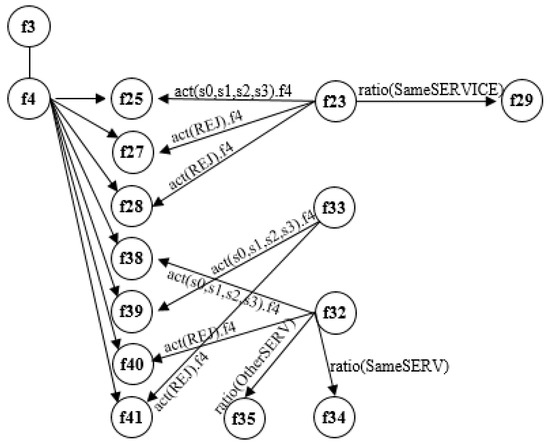 The main dataset named KDDCup contains 42 features and the KDDTrain, which was from KDDCup abstracted by 15 features in Table 1. The table shows each categorized feature according to calculation including 2 features and non-calculation including 13 features. In the two features area which does not need the calculation, we can obtain the feature value by capturing the network signals such as a flowing protocol and, at that same time, the two features are working independently. On the other hand, the 14 features which need a calculation have to compute by sharing each value it amongst the features. We designed Figure 5 to show the correlation of each feature. It shows which values are going to be transferred to which features. Basically, f25, f27, f28, f38, f39, f40, and f41 need to use a value in f4, and f23 shares the ‘Sum of connections to the same destination IP address’ with f29. f33 sends ‘Sum of connections to the same destination port number’ to f39 and to f41, f32 sends the ‘Sum of connections to the same destination IP address’ to f38, f40, f35 and to f34. Table 1 contains all features and all classes to each feature. f3 defines all network services such as HTTP, FTP, SMTP, telnet, and other services. Because all users including an attacker also use the normal network services, the analysis of f3 will be useless. Finally, we can say that to analyze f4 and (f25, f27, f28)f23, f4 and (f39, f41)f33, f4 and (f38, f40)f32 should be the priority when we try to detect anomaly signals in a network.
