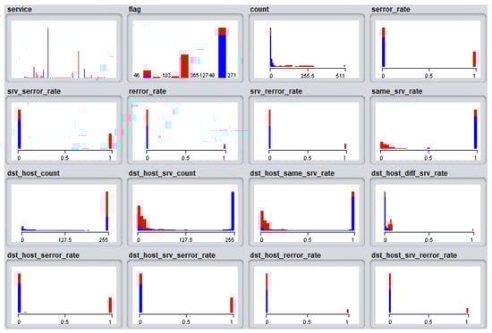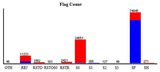 For real-time anomaly signal detection, the system must simultaneously upload continuous signal analysis results and determine the basis feature for the received signal. As mentioned above, flag(4) is chosen from the KDDTrain dataset used in this paper. The Figure 5 shows the relationship between the 15 features used, and Table 5 summarizes the number of classes in flag(4). The results according to Table 5 are shown in Figure 6. Red stands for “anomaly” and blue stands for normal. The Figure 5 contains 11 classes defined by the Flag: OTH, REJ, RSTO, RSTOS0, RSTR, S0, S1, S2, S3, SF, and SH. First, S0 received 34,851 signals, and they were all determined to be an anomaly (red color). Based on Table 4, S0 determined an anomaly with 99.7% (0.997) accuracy. REJ received 11,233 signals with a normal or anomaly judgment accuracy of 98.7% (0.987).