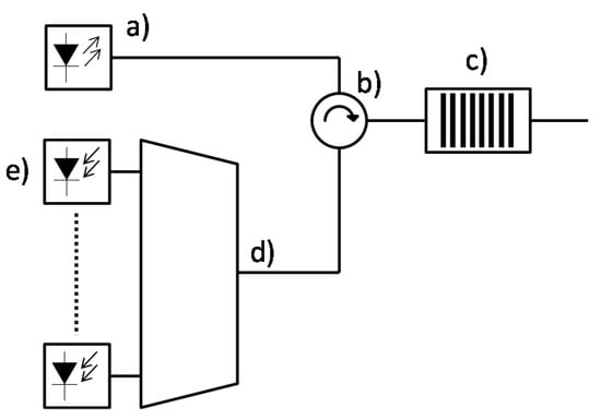 The commercially available devices usually exploit a read-out scheme basing on a broadband optical signal, e.g., from a superluminescent diode (SLED) source, launched to the sensors network, reflected, and analyzed with an optical spectrometer. In the alternative approach, a tunable monochromatic light is used, while the reflected signal is monitored with a single broadband photodetector. This enables the reconstruction of the FBG spectrum by analyzing the recorded signal in the time domain. In this work, the first approach was implemented. A general concept of the readout system for an FBG sensor network based on a broadband light source and an integrated wavelength filter–a demultiplexer with dedicated photodiodes is shown schematically in Figure 2.