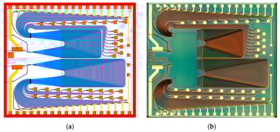 Both interrogators were designed as 36-channel devices, differing only in channel spacing, which was 50 GHz (which corresponds to 0.4 nm) and 75 GHz (0.6 nm), respectively. The free spectral range (FSR) of AWG was chosen as the channel spacing multiplied by the number of the AWG channels. Therefore, a 50 GHz channel spaced AWG was designed with an FSR of 14.4 nm and a 75 GHz one with an FSR of 21.6 nm. The chosen channel spacings of AWG were a trade-off between the readout device resolution and reasonably small chip size. The layout of the chip and its photograph are shown in Figure 3.