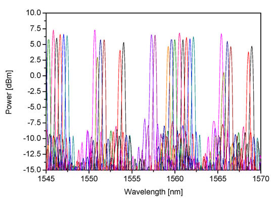 The use of a built-in SOA allows increasing the level of the photodiode current signal by 10 dB while maintaining other parameters of the AWG transmission spectrum unchanged. Figure 5 presents a transmission spectrum obtained for 16 channels of the 50 GHz AWG, when an optical signal is coupled to the input equipped with an SOA, driven with 70 mA.