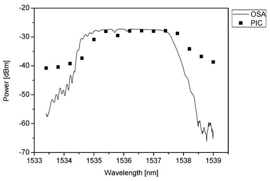 In the first experiment, the possibility of properly reconstructing the shape of the FBG wavelength response was evaluated. An FBG with FWHM equal to 3.0 nm was used, which is significantly larger than the value of the channel spacing of the AWG (50 GHz/0.4 nm). The experiment was conducted by reading out the response at 14 consecutive AWG channels and comparing the result with the reflection spectrum collected with an optical spectrum analyzer. The obtained spectra are shown in Figure 7.