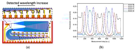 To miniaturize the system shown in Figure 2, a single photonic integrated circuit (PIC) was designed equipped with an arrayed waveguide grating (AWG) demultiplexer with outputs connected to multiple PIN photodiodes. The topology of a standard AWG (originally dedicated to telecom applications) was used and two integrated interrogators differing in the spectral resolution were placed on a single chip designed for generic indium phosphide (InP) technological platform offered by SMART Photonics [15].