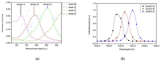 During the cycle, the results of which are shown in Figure 9, the FBG was elongated by approximately 147 µm, thus, inducing a strain applied to the grating of approximately 545 µε (microstrains). Consequently, the wavelength response of the FBG was shifted by 0.60 nm (from 1532.90 nm to 1533.50 nm). At the starting point of the measurements, diode M receives the highest incoming signal. Then, as the grating elongates, the Bragg wavelength is shifted and the increasing signal is received by the diodes O, P, and Q (in that sequence), which is clearly seen in Figure 9a. It should be noted, that as the FWHM of FBG is comparable with the channel spacing of AWG, a considerable fraction of the energy is directed to neighboring channels and is detected by the corresponding diodes. For the reference the reflection spectra corresponding to the applied tensions (tension A, B and C) were recorded with the reference interrogator, connected to the optical fiber circuit as it is shown in Figure 6 (described as “REF”). The recorded reference spectra are shown in Figure 9b.