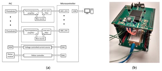 The dedicated electronic driver, shown in Figure 10 enables simultaneous processing and collection of all 36 signals from the photonic circuit electric ports. Its architecture is based on an STM32F303ZDT6 microcontroller, equipped with analog front-end circuitry and analog-to-digital converters (ADC). A current signal from each photodiode of the interrogator is amplified and converted to the voltage signal using a trans-impedance amplifier (TIA) and processed with a low-pass filter. The output signal is then subsequently digitized by an ADC. Finally, all the recorded signals are exported in real-time mode together with a timestamp to the PC via USB interface. The PCB layout enables direct assembly of a packaged PIC. Figure 10 presents a functional block diagram of the dedicated electronic driver with a packaged interrogator chip mounted on it. The approximate power consumption of the packaged device is 1.3 W.