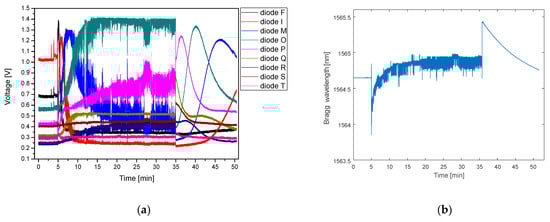 At the beginning of the measurement, the FBG plate was conditioned for 5 min at room temperature. After that, a heating pad filled with water of a temperature of 35.7 °C was placed on the sensor plate, which resulted in heating the sensors, and in turn, in a continuous shift of the Bragg wavelength towards longer wavelengths. After around 20 min the temperature of the FBG sensors (which went up during this time) and the heating pad (which went down) equalizes. Then, as the heating pad temperature consecutively decreases, the FBG temperature begins to decrease, so the Bragg wavelength starts to shift towards shorter wavelengths. At the 57th min of the measurement, the heating pad was removed from the sensor plate, which then started to cool down more quickly. Such changes of the temperature can be clearly visible in the time domain characteristic, presented in Figure 11b, measured using a reference FBG interrogator.