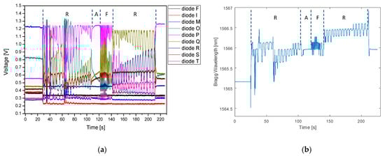 Figure 13 presents a five-minute-long zoom-in of the time traces presented in Figure 12, recorded after the temperature of the grating stabilizes. Throughout the measurement cycle, the person was breathing steadily at a natural pace, with a breathing period of c.a. 6 s. The chest movements induced stress on the FBG, which in turn, caused periodical variation of the Bragg wavelength, clearly visible both on the reference characteristic (the average period equal to 6.1 s) and on the signals from the photodiodes. Diodes F, I, and M are responding in this same pattern. The signals of the diodes F and I are very weak, as the FBG spectrum lies outside their wavelength channels. Diodes O, P, R, S, and T work in antiphase to previously described diodes. The strongest response is observed for I, M, and O diodes, as they cover the peak of the signal reflected from the FBG. Diode Q is not responding, due to its malfunction, mentioned above. It is seen that the breathing period detected by the PIC and the reference interrogator are very well matched.