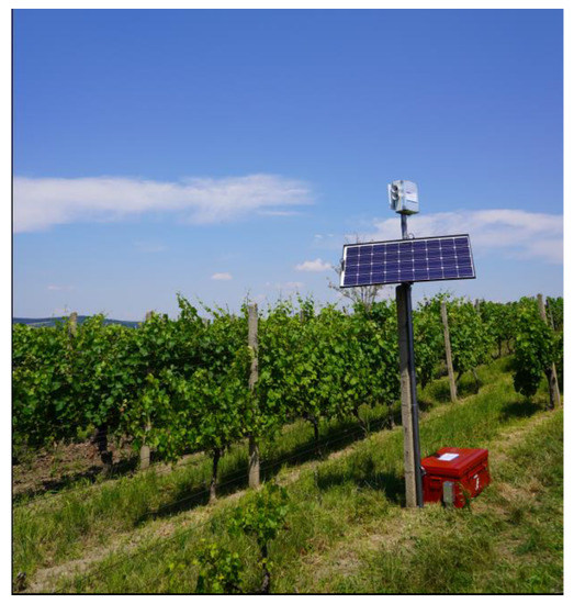 34]. For this purpose, we employed a photovoltaic panel exhibiting the following parameters: Max power 100 W, open circuit voltage (Voc) 21.6 V, short circuit current (Isc) 6.11 A, max power voltage (Vmp) 18 V, and max power current (Imp) 5.55 A. The electricity obtained from this panel was transferred to the solar charger controller and then fed directly to the devices or stored in the battery. In In island systems, a key factor consists in low consumption; we therefore implemented in the design a time delay switch to activate the entire setup an hour before sunrise and to shut it off an hour after sunset. Thus, we enabled the installed optical detector to operate over the complete grape harvest period in the Czech Republic.