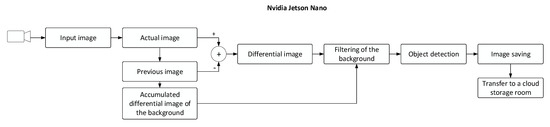 Figure 4). This technique exploits the principle of a movement detector capable of eliminating false detection caused by the quivering of grapevine leaves or the green vegetation in the vicinity. By simply subtracting the current image from the previous one, we yield a differential image, which is then converted to a binary image resulting from a predefined threshold. Simultaneously, an accumulated differential image of the background is being created to be later subtracted from the differential image; thus, we ensure the filtering of the background. Furthermore, object detection via the recognition of binary contours is in progress; during the operation, any image containing a positively detected item is stored and sent to a cloud storage room. A binary differential image and a highlighted region around a detected object are shown in