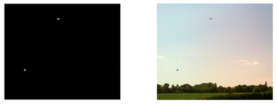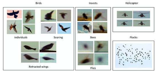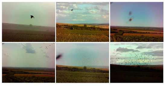 36]. The captured set included all items that had changed their positions by at least one pixel between two instances of imaging. The images contained individual birds, bird flocks, insects, and other objects. In total, we executed approximately 300,000 detection shots, and these then allowed us to use in the research a corresponding number of images with detected items. From such a perspective, the differential method for the detection of moving objects appears to be wholly insufficient in monitoring only a single concrete item; in our case, however, the object is a flock of birds. The acquired images nevertheless embodied a good input to support the subsequent application of deep learning. To prepare for this procedure, we classified and annotated the images, eventually obtaining a set of training images. The result was a classification model implemented in a microcomputer to facilitate the visual detection of bird flocks.