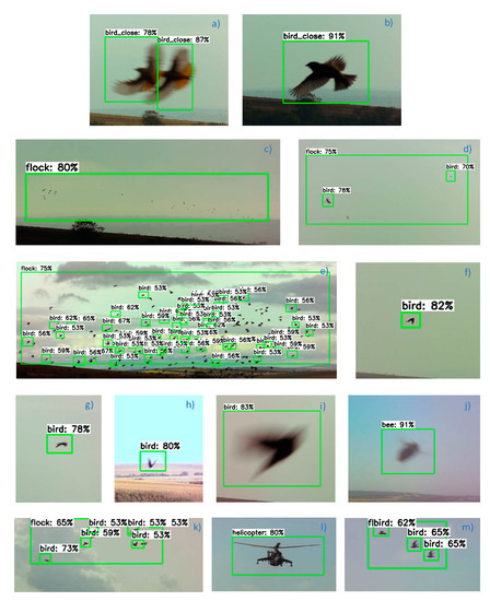 To optimize the AI algorithms, we first acquired approximately 300,000 images to choose items suitable for further processing. After this pre-selection, the testing dataset comprised 134 images containing 1008 ground truth objects. Within the presented results, the precision rates obtained in the birds, insects, and flocks amounted to 83.4%, 65.8%, and 100%, respectively. The set of bird flock images captured 35 objects; of these, 33 items were detected correctly, and two exhibited falsely negative classification. At this point, it should be emphasized that the resulting classifier evaluated the flocks correctly up to a distance of 300 m.