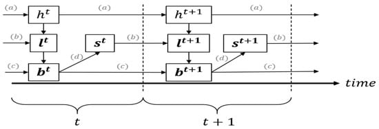 The belief state is the probability distribution of the health states of the patient given the past measurements. Next, we prove that tracking belief states instead of all past measurements comes with no loss of optimality (i.e., it is a sufficient statistic) and that it can be recursively updated. During the monitoring period, the belief states evolve based on the outputs, received from the activated sensors, . Below is a schematic description of the order of events in two specific subsequent epochs: