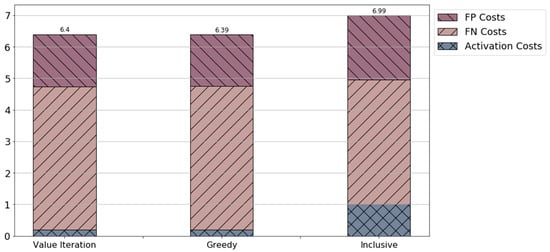 As expected, higher values of result in higher costs for all policies, whereas near-zero values provide low costs down to the point where the sensors are perfect, which results in identical low costs for all the policies (see Figure 12). For values higher than 0.3, the sensors yield very low-accuracy outputs, causing the controller to deactivate the sensors throughout the sensing period. For the majority of examined values, the proposed greedy policy was nearly optimal. Only for very inaccurate sensors with is the total cost of the greedy policy more than 5% higher than that of the (approximately) optimal value iteration. This is encouraging, since medical sensors are typically required to be highly accurate in practice due to the possible implications.