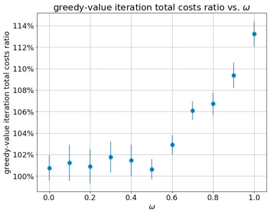 Our results from Section 5.5 suggest that the greedy policy is nearly optimal for the scenario we extracted from the real glucose data. To establish this statement, we now conduct a sensitivity analysis of two main system parameters. We start by varying the parameter between 0 and 1, thus changing the weight of the two cost components in Equation (16). Lower values of result in emphasizing power cost reduction while higher values result in minimizing misclassification costs. Figure 5 below demonstrates the cost ratio between the greedy and value iteration methods. Each point considers the total costs obtained over all patients, and the error bars show the standard deviation of this ratio over the patients.