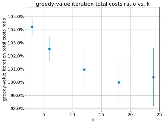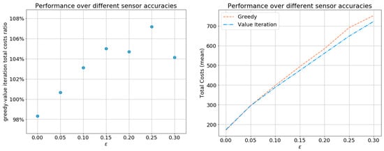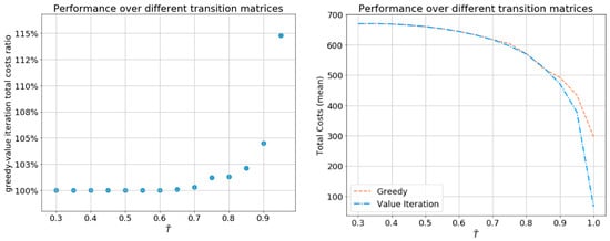 Note that determines the stability of the health state trajectories. For lower values of , the obtained transition matrix is more uniform. For the value , the policies yield the highest possible costs, since then, provides no information concerning the patient’s potential health state trajectory. For higher values of , the transition matrix causes higher-stability health state trajectories. For the majority of values examined, the greedy policy is nearly optimal, showing the largest gap when the total costs of both policies decline for higher values of . For the most extreme value of (not shown in the left graph in Figure 13), for which the heath state is static, the total cost of the greedy policy is 450% compared to the value iteration policy.