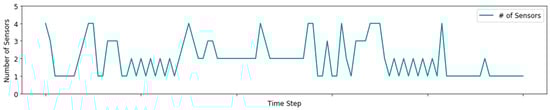 Figure 9 shows the number of sensors activated throughout the simulation. One can observe that the largest number of sensors is usually activated during health state transitions, i.e., in periods where the patient’s health is relatively unstable. In addition, Table 3 summarizes the dynamics of the activated sensors regarding their different accuracies and costs. For example, even though sensor 5 incurs low costs, it is almost never activated due to the low accuracy it provides. Sensors 1 and 4 are informative regarding and . Although sensor 1 is very accurate compared to sensor 4, it is activated during a smaller number of epochs, which follows due to the lower costs incurred by sensor 4.