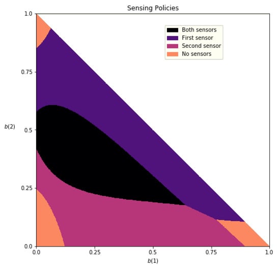 Figure 10 maps the belief states into the subset of activated sensors. We observe that the controller tends to activate both sensors in the mid-ranges of the belief states, i.e., in areas where the information concerning the patient’s active health state is not definitive. As the belief states move toward the edges of the graph, fewer sensors are needed because there is higher certainty concerning the patient’s active health state. In the far corners of the graph, no sensors are activated. We note that the distinction between the use of the first and second sensors, when activating only one sensor, is related to each sensor’s ability to differentiate between a different pair of health states.