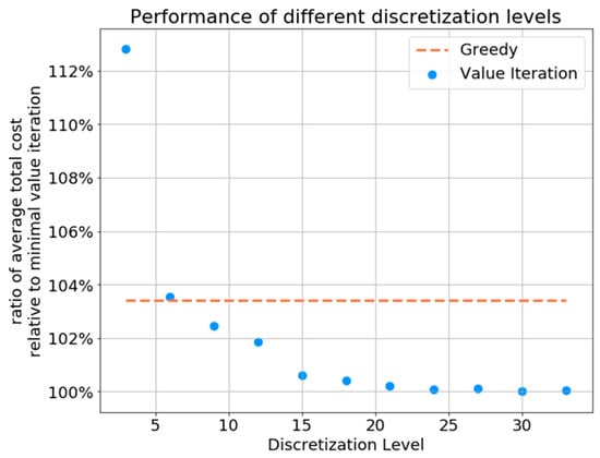 Figure 11 demonstrates the effect of varying the discretization resolution on the performance of the dynamic programming solution. The x-axis shows the “binning” resolution defined for the discretized belief state space. Higher discretization levels lead to higher accuracy when approximating actual belief states. We can see that for lower values of discretization levels, the greedy policy outperforms the dynamic programming formulation, while for higher levels, the value iteration solution outperforms the greedy solution and converges to an average total cost that is approximately 3% lower than that of the greedy solution. Overall, the greedy solution shows a maximum gap of less than 4% from the dynamic programming solution for high discretization levels.
