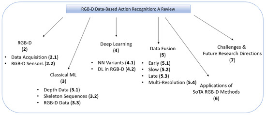 The remainder of this paper is organized as follows. Section 2 discusses RGB-D modality and data acquisition. Section 3 and Section 4 review the classical machine learning-based methods and deep learning-based methods, respectively. Section 5 discusses the use of different data fusion techniques used in HAR. Section 6 gives a summary of applications of state-of-the-art RGB-D methods in different scenarios. Section 7 outlines different challenges in data fusion and action recognition techniques, and discusses the future research directions. Finally, Section 8 concludes the review. The hierarchical structure of this paper is shown in Figure 1.