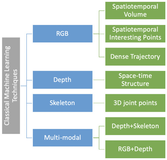 Classical machine learning-based action recognition techniques use handcrafted features and can be classified on the basis of RGB data [18], depth data [49,50], skeleton sequences [51], and methods using a combination [52] of these data modalities (as illustrated in Figure 4). Table 2 summarizes the best performing techniques which achieved benchmark accuracies for popular RGB-D datasets in action recognition research. The following subsections will discuss depth-, skeleton-, and RGB-D-based methods.