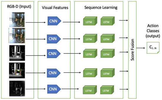 LRCN uses CNN in co-ordination with an LSTM-based network. In LSTM-based deep learning methods, actions can be represented as feature changes between frames in the video, LSTM is widely used to improve action recognition techniques. Ng et al. [117] have presented a linear RNN for recognizing human actions that connects the output of a CNN with an LSTM cell. A new architecture—P3D ResNet—has been proposed by Qiu et al. [118], which uniquely places all the variants of blocks in a different placement of ResNet. In skeletal data, to deal with noise, Liu et al. [119] extended the idea to analyze spatio-temporal domains simultaneously by introducing an effective tree structure-based traversal framework. This framework uses a cross-modal feature fusion strategy within LSTM unit and a gating mechanism to learn the reliability of sequential data in long-term context representation. For mapping video frames with variable length inputs to variable length outputs, Donahue et al. [120] have proposed an LRCN. Unlike those methods that learn CNN filters based on a stack of a fixed number of input frames, LRCN [120] is not constrained to fixed-length input frames and thus can learn to recognize more complex action video. As illustrated in Figure 6 (RGB-D input visuals taken from the work in [31]), individual video frames are first passed through CNN models with shared parameters and are then connected to a single-layer LSTM network. More precisely, the LRCN model combines a deep hierarchical visual-feature extractor, i.e., a CNN feature extractor, with an LSTM that can learn to recognize temporal variations in an end-to-end fashion.