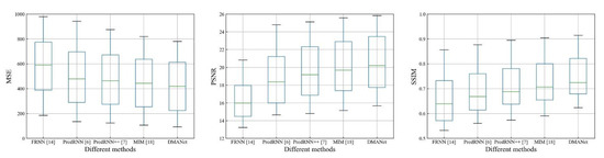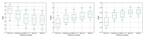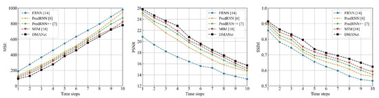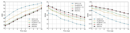 | PredRNN++ [7] | 46.51 | 20.22 | 0.88 | 479.26 | 19.57 | 0.71 | 16.54 | 32.35 | 0.91 |