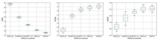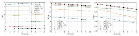 | PredRNN [6] | 58.82 ± 15.58 | 19.66 ± 1.86 | 0.86 ± 0.04 | 503.84 ± 259.64 | 18.83 ± 3.31 | 0.69 ± 0.10 | 19.81 ± 0.28 | 30.81 ± 0.31 | 0.89 ± 0.02 |