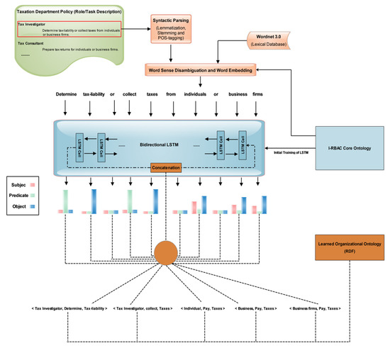 First, organizational textual policy is preprocessed through POS (Part-of-Speech) tagging using the “CoreNLP API”, then word sense disambiguation is performed on this text using Wordnet 3.0, which is a lexical database of words, and it contains semantic relations between words. Word embedding is also performed on POS tagged text using the Word2Vec technique. Here, cosine similarity is measured among all words and their synonyms. After that, the output is fed to bi-directional LSTM (Bi-LSTM) [47] for extracting structured knowledge in the form of triples (subject, predicate, object). The reason for choosing Bi-LSTM is that it outperforms other models in such problems as it uses two LSTMs that increase the information to network about each sentential word’s context. It helps in finding the context of each word more effectively by knowing the words that immediately follow and precede it in the sentence. Figure 2 illustrates the whole process of automated population of organizational ontology from policy text.