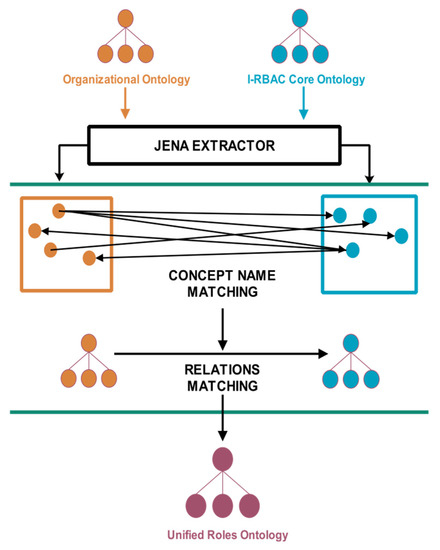 After extraction of the organizational schema (i.e., RDF) by LSTM, this schema automatically populates the organizational ontology, which will be further matched with core I-RBAC ontology in order to extract unified business roles through agents. Therefore, ontology matching and mapping are very important tasks during the semantic role mining process. Sometimes, the ontology matching term is alternatively used as semantic matching, which refers to computing relationships between the nodes of two different graphs.