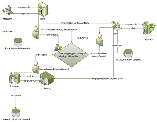 The experiments were run through simulating collaborative case scenarios of information sharing among five organizations belonging to three different domains (two Universities, two Banks and a Taxation department). Overall, 113 roles were created from these organizations. The same user could be assigned different roles at different stages depending on collaborative tasks at that particular time, and his/her organizational policy text defining tasks and permissions for each role. One of the collaboration scenarios is illustrated in Figure 8. For example, in this illustrated scenario, a Tax Calculating Officer (TCO) has an account in the Bank and his children are in the University, and he also has a tax account in the taxation office where he works. So, this person wanted access to different resources at different time intervals and he was assigned different roles as per predefined rules and structured knowledge stored in ontologies.