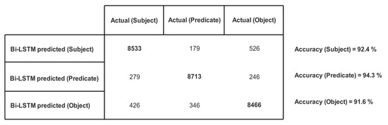 Confusion matrix showing no. of actual and Bi-LSTM predicted subjects/predicates/objects.