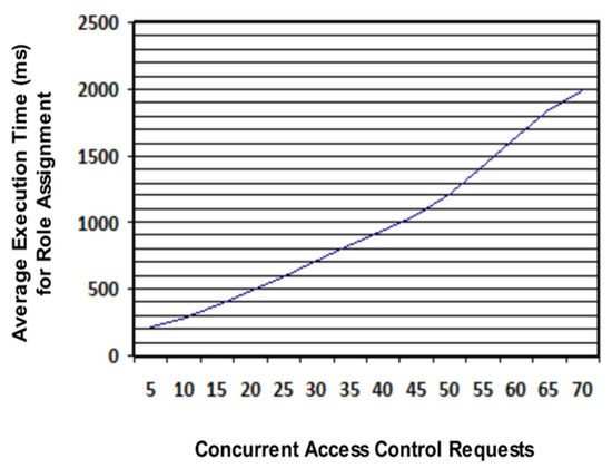 In each collaborative scenario, different access control requests were made by users. In total, 3260 access control requests were made for role assignment. Collaboration scenarios are designed in a way that concurrent access control requests are gradually increased from 5 to 70 and the average response time of system, for assigning roles, is recorded. It was observed that our system responded within 2 s for a maximum of 70 concurrent access control requests, as illustrated in Figure 11. Hence, it proves the high scalability of our system.