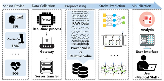We propose a novel system for predicting stroke based on deep learning using the raw and attribute values of EEG collected in real time, as presented in Figure 1. The proposed system is composed of (1) a module that collects data in real time; (2) a module that transmits the real-time generated biological signals to the server; (3) a module that analyzes the stored biological data, then extracts and manages frequency attributes; (4) a deep learning-based learning and prediction module; and (5) a biological-signal-based stroke prediction analysis. Next, the initial system extracts and stores a set of pretreatment processes and features based on various biological signal data, such as EEG data and ECG data collected from elderly people. Finally, the stored bio-signal data is used as input for deep learning models to predict and analyze stroke anomalies in older adults in real time.