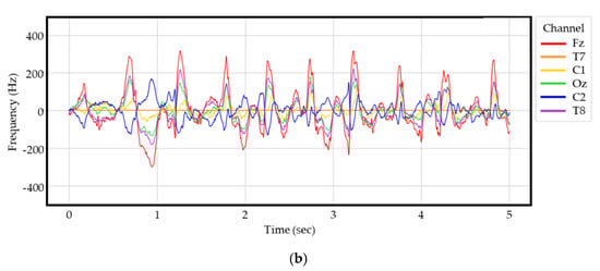 The lines on the graph represent the raw values collected from the six channels shown in Figure 2, while the vertical axis represents frequency in Hz and the horizontal axis represents time. For time, periods of at least five seconds were used to differentiate the walking data. Overall, using only raw EEG data from stroke patients and normal controls to distinguish and determine stroke disease can be difficult for medical professionals. In addition, medical professionals need time to make a proper diagnosis of stroke. In this study, we conduct experiments and validations with the goal of providing meaningful information and ultimately designing and implementing systems that can help medical staff make judgments more quickly, rather than simply attempt to develop a system that can predict stroke early. Figure 3 shows examples of the raw EEG data in (a) stroke patients and (b) normal controls.