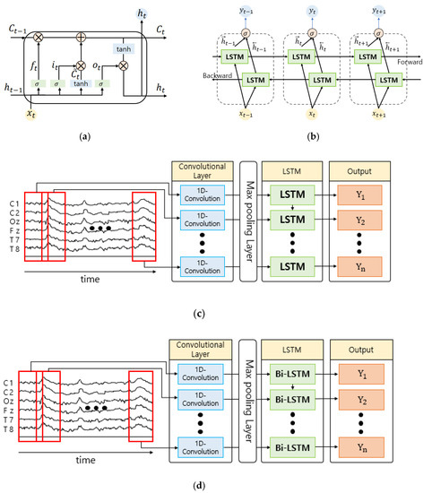 EEG data are time series data that consist of sequential values over time, and it is necessary to consider time information in the learning process. Therefore, in our stroke prediction module we transform and optimize the structure of a deep learning model to obtain a model that can address the characteristics of time series data well and use it in experiments. The deep learning models that were analyzed were CNN [27,28], LSTM [49], bidirectional LSTM [44], etc. CNNs can reduce computation volume through the use of basically shared parameters, and they have the advantage of mitigating overfitting. Moreover, CNNs are increasingly being used to research and develop models by extracting the optimal properties to improve classification and prediction performance. The LSTM model can predict the next stage of time series data by considering both future and historical information of time series data, which can solve the long-term dependency problem. Finally, Bidirectional LSTM is a structure that can overcome the structural limitations of LSTM, where the results of the latter tend to converge based on the last-minute pattern by adding a reverse processing layer to the existing LSTM layer. In this work, we selected four models to fit the time series data classification using the advantages of each model, which are illustrated in Figure 5.
