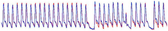 Comparison of normalized invasive arterial line data (red) taken simultaneously with normalized PyrAmes sensor data (blue).