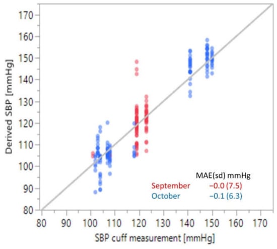 The mean average error (standard deviation) was −0.0 (7.5) mmHg in September and −0.1 (6.3) mmHg in October, well below the FDA guidelines of < ±5 (8) mmHg [84]. This suggests that the approach of using the pulse waveform data to derive blood pressure values is feasible and somewhat robust over time, potentially without additional calibration.