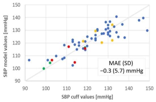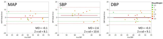 Figure 7 shows Bland-Altman plots for MAP, SBP, and DBP with the average of model and ground truth values for each individual on the x-axis and the average difference between model and ground truth values for each individual on the y-axis (model error or mean difference (MD)). The points are color-coded by the weight of the patient in kilograms. The solid red line shows the mean average error or bias. The green dotted lines indicate the FDA guidelines for the limit of acceptable error for the population of ±5 mmHg. The red dotted lines indicate the 95% confidence interval (1.96 × the standard deviation of the error in the measurement). The mean absolute error is 4.1, 5.5, and 4.7 mmHg for MAP, SBP, and DBP, respectively.