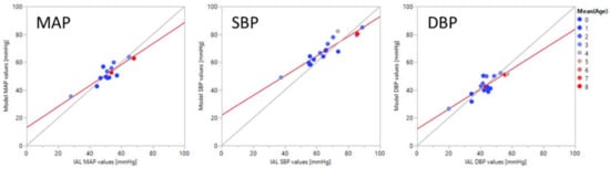 In Figure 6, mean average values of MAP, SBP, and DBP extracted with BP-model-3 are compared against corresponding blood pressure values measured simultaneously with an arterial catheter. Each point represents the average value for all the points taken for an individual. The color of the point indicates the age of the patient in days. The derived BP values are well correlated with the ground truth values, with correlation coefficients of 0.91, 0.93, and 0.85 for MAP, SBP, and DBP respectively.