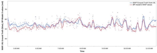 Comparison of invasive arterial line (blue) and BP-model-3 (red) mean arterial pressure (MAP) values as a function of time. Each data point is averaged over a one-minute interval. The curves are a spline fit with lambda = 1 × 10−6.