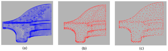 We chose the geometric error between the original and the simplified point cloud as a metric to evaluate the quality of the proposed simplification method, following Pauly et al. [9]. Similarly, we measured the maximum error distance and the average error distance between the original point cloud, , and the simplified point cloud, . We denote the surface of as and the surface of as . The simplified error is estimated using the maximum error (16) and the average error (17) as follows: