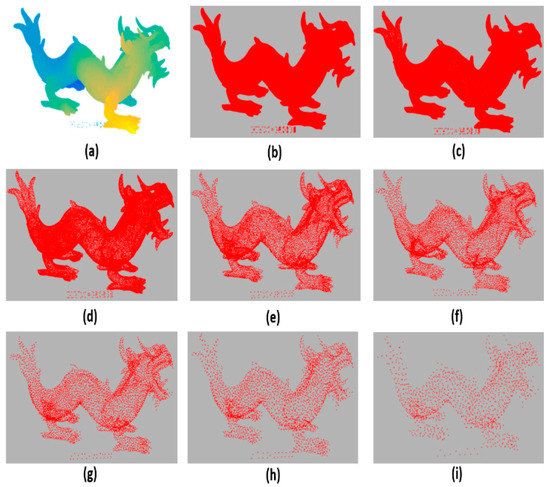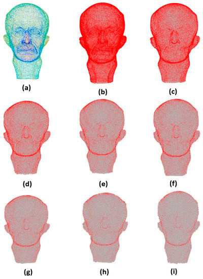 Table 2 shows the different values of the parameter for different simplification rates; we can appreciate how the variation of does not clarify the relationship between the number of points to be simplified and its values in the table. This indicates that the algorithm is sensitive when its values change between different simplification rates, showing a weakness of the algorithm, which can be improved if the parameter can be related to the density and distance between the points of the cloud to be simplified.