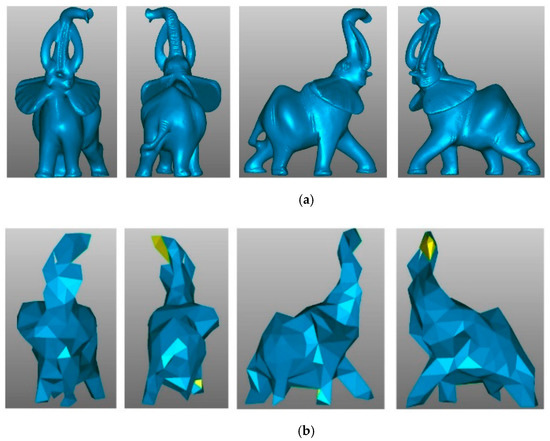 The Elephant model: (a) original, reconstructed with 24,955 points; (b) simplified, reconstructed with 167 points.