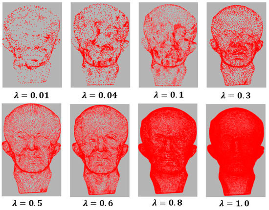 There are three parameters in our method: the regularization parameter in Equation (3), the dictionary size S, and the fraction of points to be simplified . The parameter is the balance between the data fidelity and the regularization term. Small values can produce a simplification with few details, points, and features, while large values can result in more details, points, and features (see Figure 8). In all our tests, we set , which obtains the best results since this value maintains the balance between the number of points and the features.