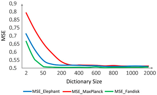 We established the size of the dictionary, , based on Figure 8. It shows the mean square error (MSE) variation as the dictionary size increases. As the size of the dictionary increases, the MSE decreases, but processing time increases. On the other hand, when the dictionary size is reduced, the MSE increases, but the processing time decreases. Our goal was to find a balance between a suitable dictionary size and low processing time.