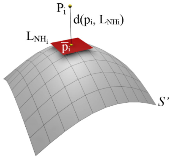 The eigenvector corresponding to the smallest eigenvalue is the normal vector at point . Pauly et al. [9,26] proved that the surface variation is equivalent to the surface curvature, as defined in Equation (6).