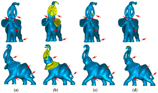 Figure 12b shows the result of simplifying the elephant using only the normal and curvature, excluding the point coordinates from the feature vector of each point. Compared with the original model (Figure 12a), the simplification has overdecimated some areas (ears, tusk, and tube), producing holes in the reconstructed model. On the other hand, the lighting in the simplified model mimics the original one (red arrows). Figure 12c shows the simplification results for the Elephant model using the point coordinates and curvature, excluding the normal from the feature vector of each point. Compared with the original, the point density is maintained, producing a better reconstruction of the model surface, but the lighting of the simplification does not improve, as shown in Figure 12b (see highlighted details). Finally, Figure 12d shows the simplification results for the elephant using the normal, the point coordinates, and the surface variation (curvature). The combination of features improves the results, as shown in the details in the lighting and the preservation of details such as the elephant eye.